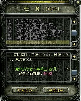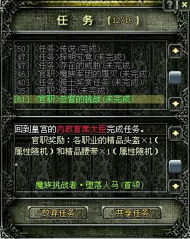 挑战类型的任务,需要进入副本与魔族战斗以完成任务。进入官职挑战魔族战场可通过位于主城的天朝警备司令(天朝)、帝国陆军元帅(帝国)进入,进入挑战魔族战场后再交互魔族战场内的祭坛长老选择相应的官职挑战。如在官职挑战魔族战场中失败,任务未完成可不必放弃任务,可到皇宫引路人重新接取战场入场券任务。