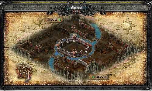 反“S”型要塞战场,从图中可以得知,天朝和帝国的军队将分别由上下两个出入口进入战场。在战场中,开始双方各有两个默认的小型要塞或者说据点,每个据点中均有驻守的NPC,还会不定时的刷新一些补给品。如短时间增加属性的物品,或者可恢复生命和魔法的物品,还会刷新一些稀有物品,如范围复活,全体增加同阵营的攻击力或者防御力等等。这些物品在当前据点没有被敌方占领的时候只能被己方使用,使用之后便消失。同时据点也是可以被占领的,方法是击杀每个据点的NPC守卫军官。每个据点的NPC守卫中,均会有几名守卫军官,他们属于精英级守卫,不但拥有极高的属性而且会发动技能攻击,不是轻易就能搞定的。占据据点不但可以享受到据点的物品,而且据点中会重新刷新你方的NPC,还会为你方在战场中的成绩加分。